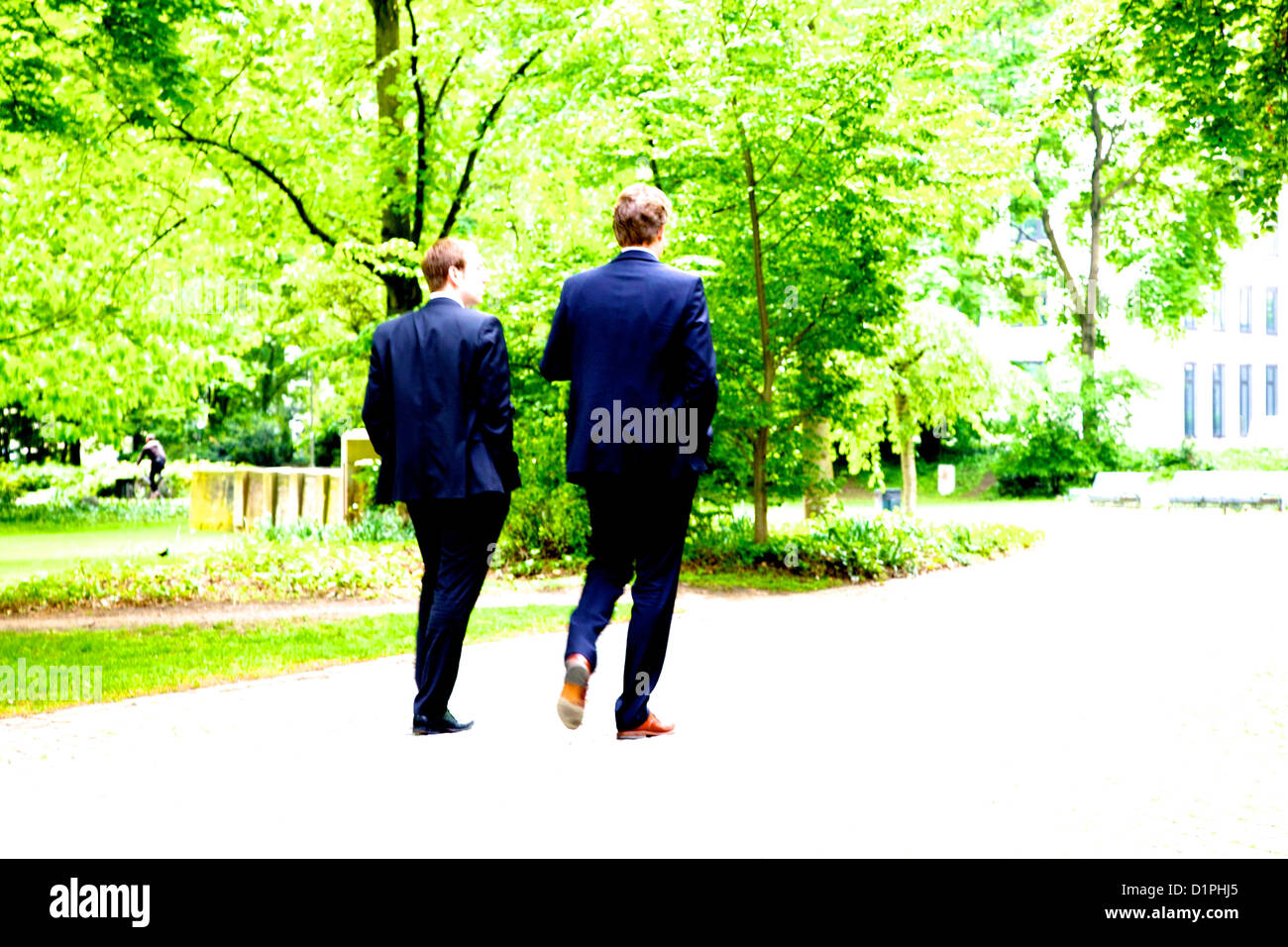 Two Business Men In Blue Suits Walking Through A Park In Hamburg