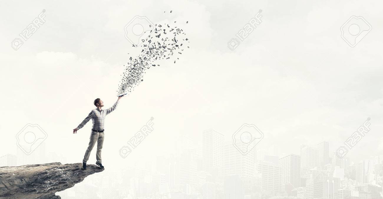 Young Handsome Man Reaching Hand With Book And Characters Flying