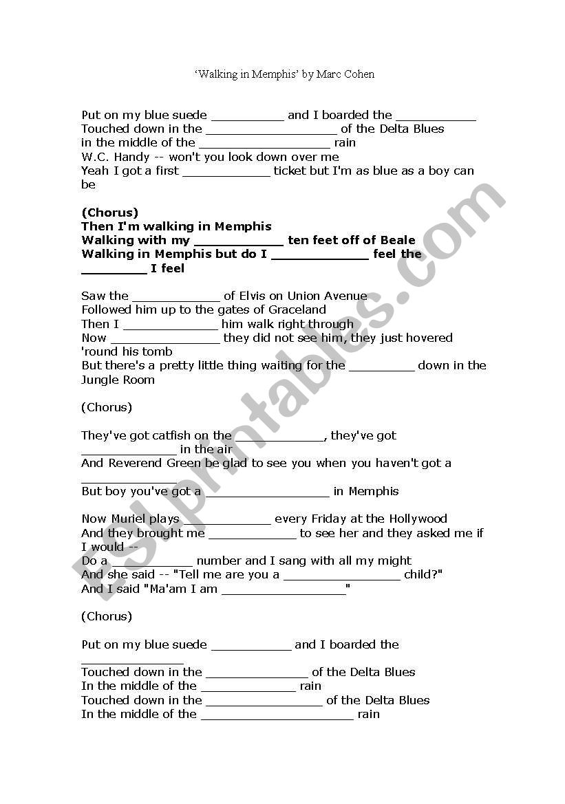 English Worksheets Walking In Memphis Marc Cohen Song Gap Fill